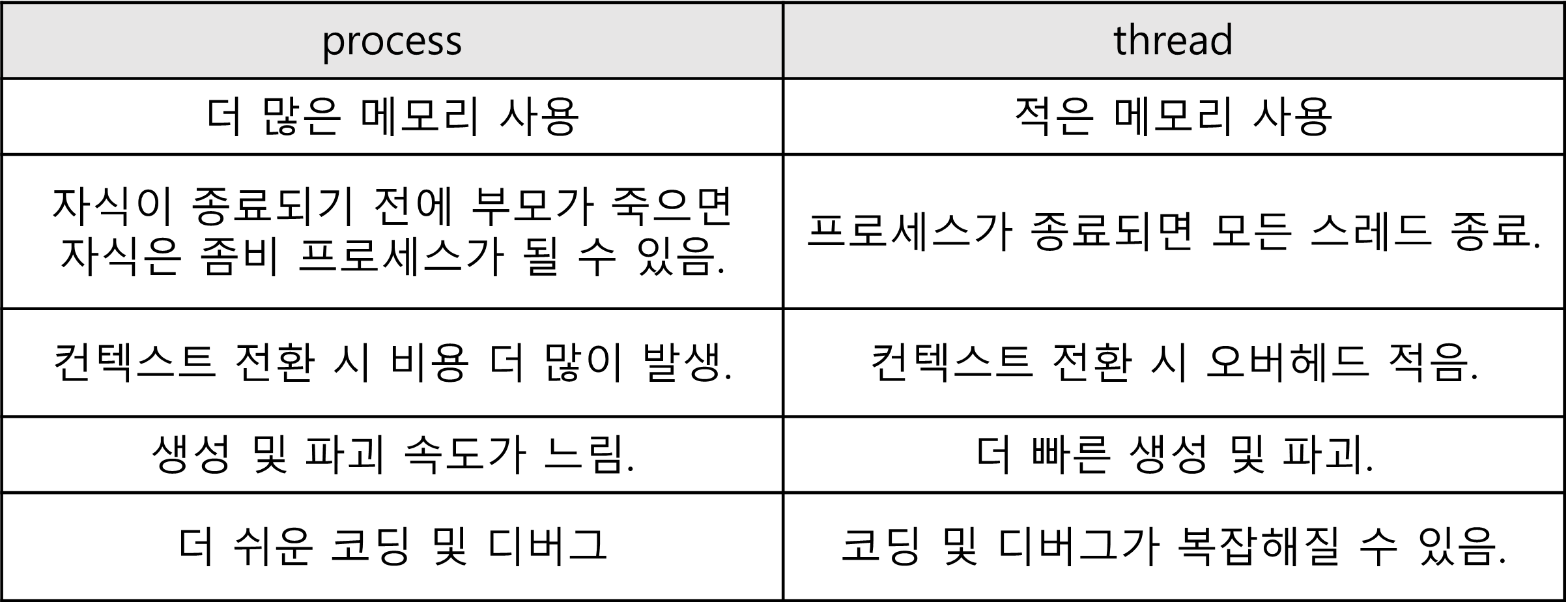 주요 특징으로, 스레드는 생성 및 파기 와 동일 프로세스 안에서 스레드끼리 전환하는 것이 프로세스에 비해 빠르기 때문에 Multi Process 에 비해 적은 오버헤드를 유발한다.