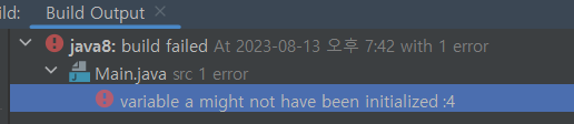 변수를 초기화하지 않고 출력하는 코드를 돌렸을 때, build 가 실패했음을 확인할 수 있다.