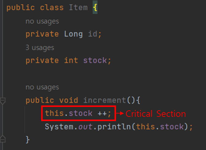 예시는 아래와 같다. Item 클래스와 해당 클레스의 멤버 변수들은 힙에 할당된 공유 자원으로 모든 스레드에서 접근이 가능하고, 공유 자원의 값을 변경하는 코드 세그먼트를 보여준다.
