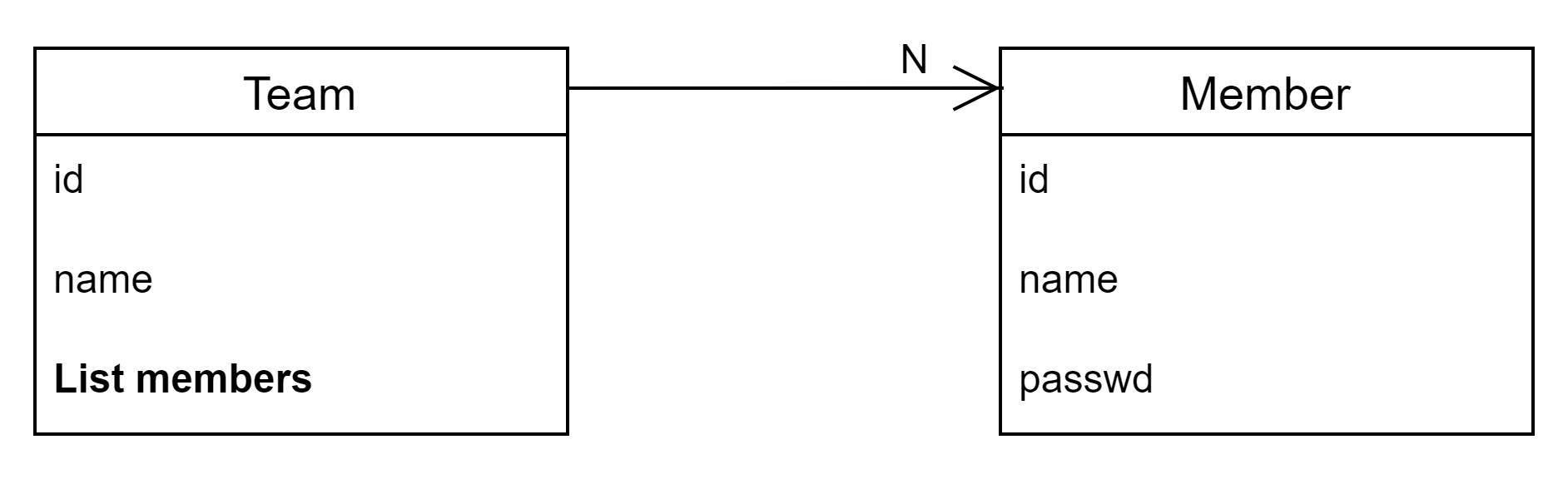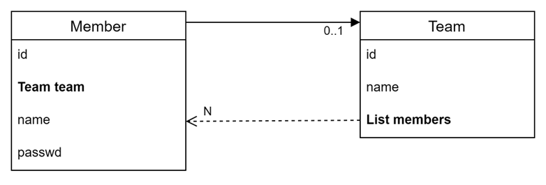 일대다 관계의 예로 팀과 회원을 볼 수 있다. 하나의 팀은 여러 회원을 참조할 수 있고 (일대다) 팀은 회원들을 참조하지만 반대로 회원은 팀을 참조하지않는다. (단방향)