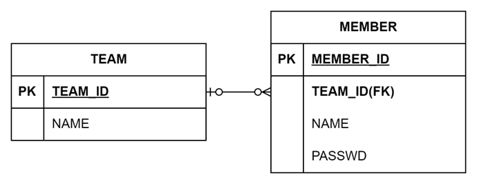 이를 UML 로 보면 아래와 같은데 일대다 관계에서 외래키는 항상 다(MEMBER)쪽에 있음을 확인할 수 있다.
