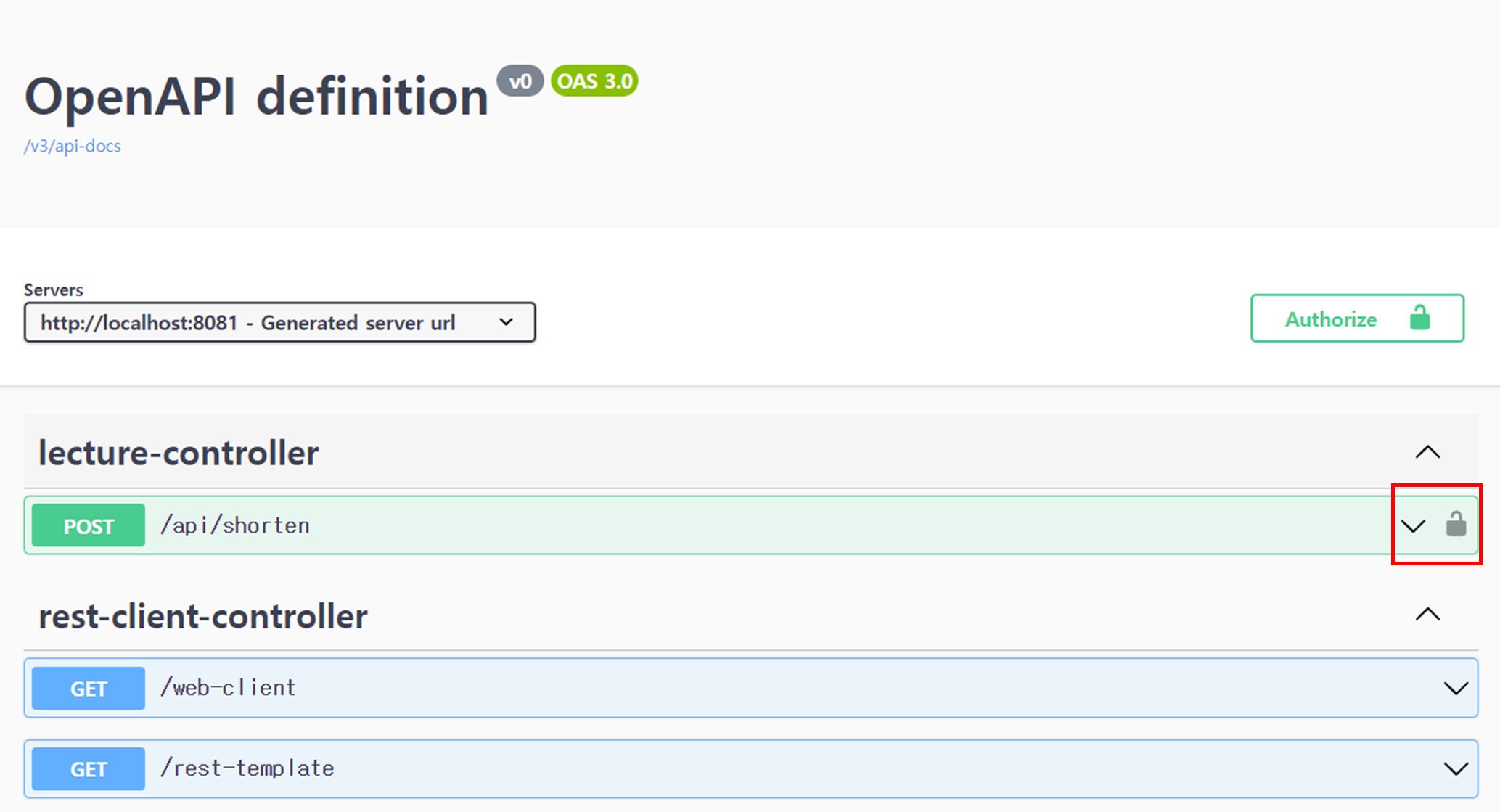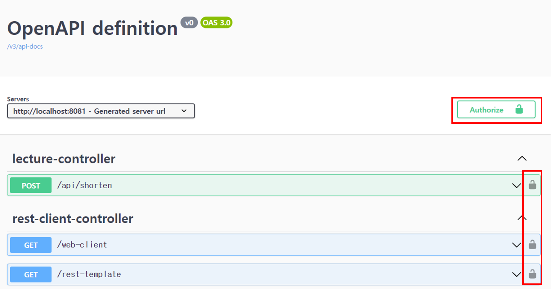 swagger url 에 접속하면 자물쇠가 각 API 마다 생성되었음을 확인할 수 있다.