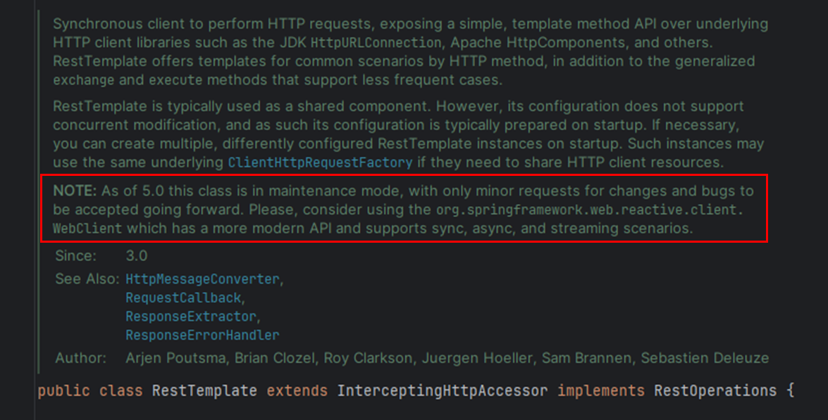 우선 spring-web 6.0.13 기준으로 RestTemplate 문서를 확인해보아도 deprecated 되었다는 말은 찾아볼 수 없다.