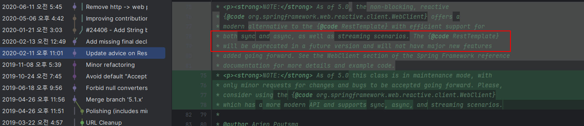 요약하자면 RestTemplate 은 depreacated 되지 않았고 Spring 은 WebClient 사용을 권장한다는 것이다.