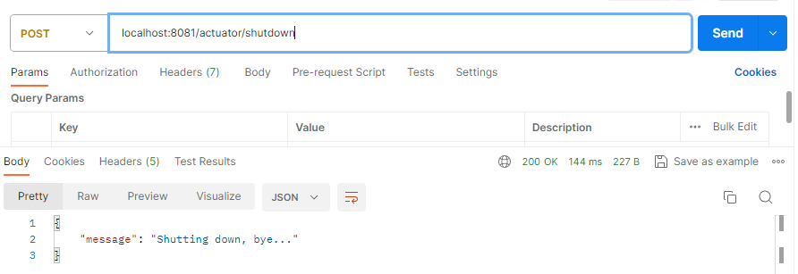 $ curl 'http://localhost:8081/actuator/shutdown' -i -X POST