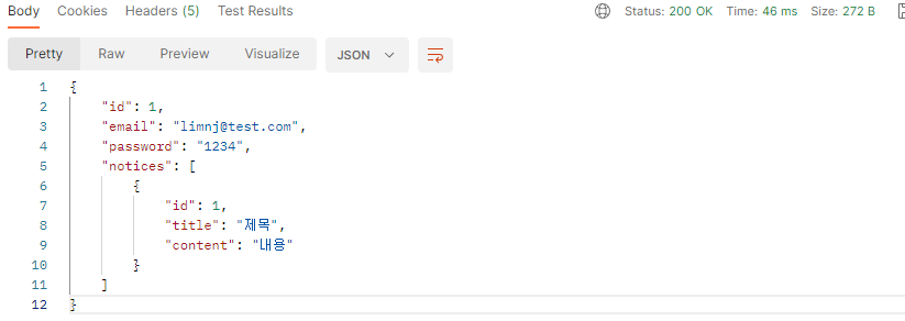 - 이를 적용하였을 때 User 객체를 직렬화할 때는 Notice 객체가 포함되지만, Notice 객체를 직렬화할 때는 User 객체가 포함되지 않는다.