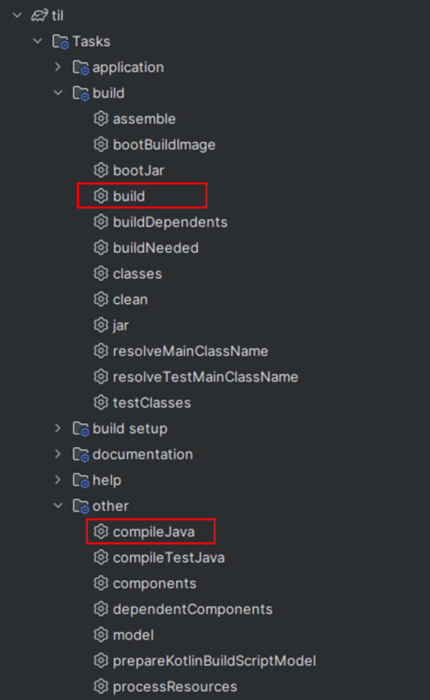 - compileJava : 자바 소스 파일을 컴파일한다. 소스에서 Java 소스 파일만을 대상으로 하며, 이러한 소스 파일을 JVM 에서 실행할 수 있는 바이트코드로 변환한다. build 의 일부로 자동 실행되며 자바 소스 코드만 컴파일하고 싶을 때 따로 실행할 수 있다.