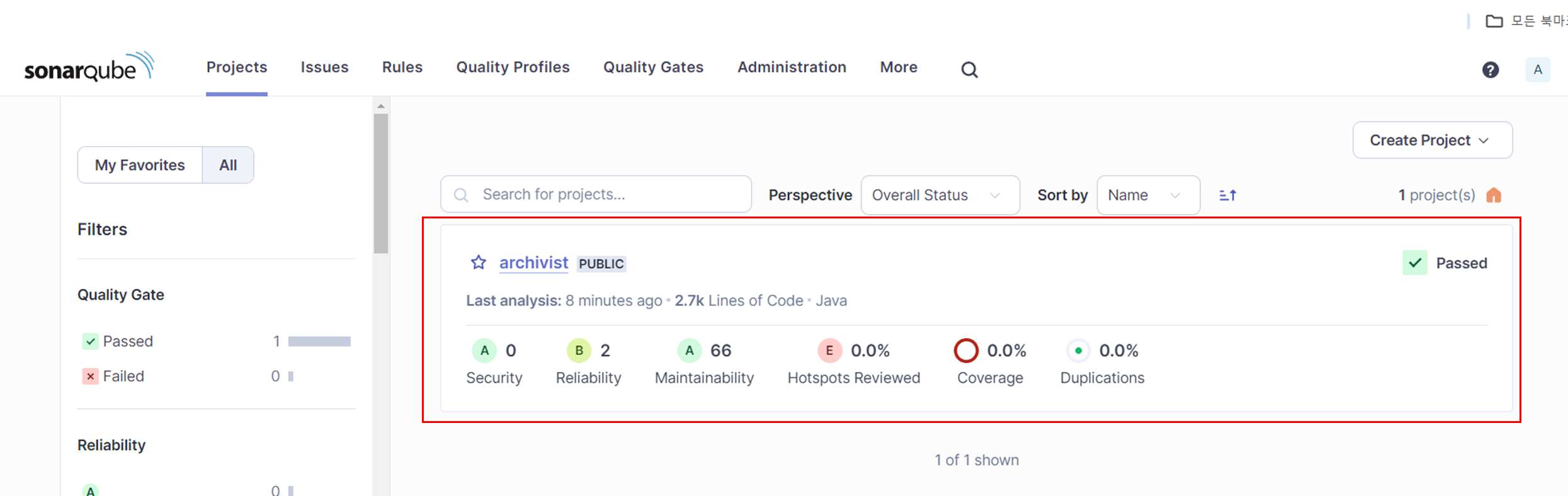 1. Projects Tab : SonarQube 서버에 등록된 모든 프로젝트를 볼 수 있다.
