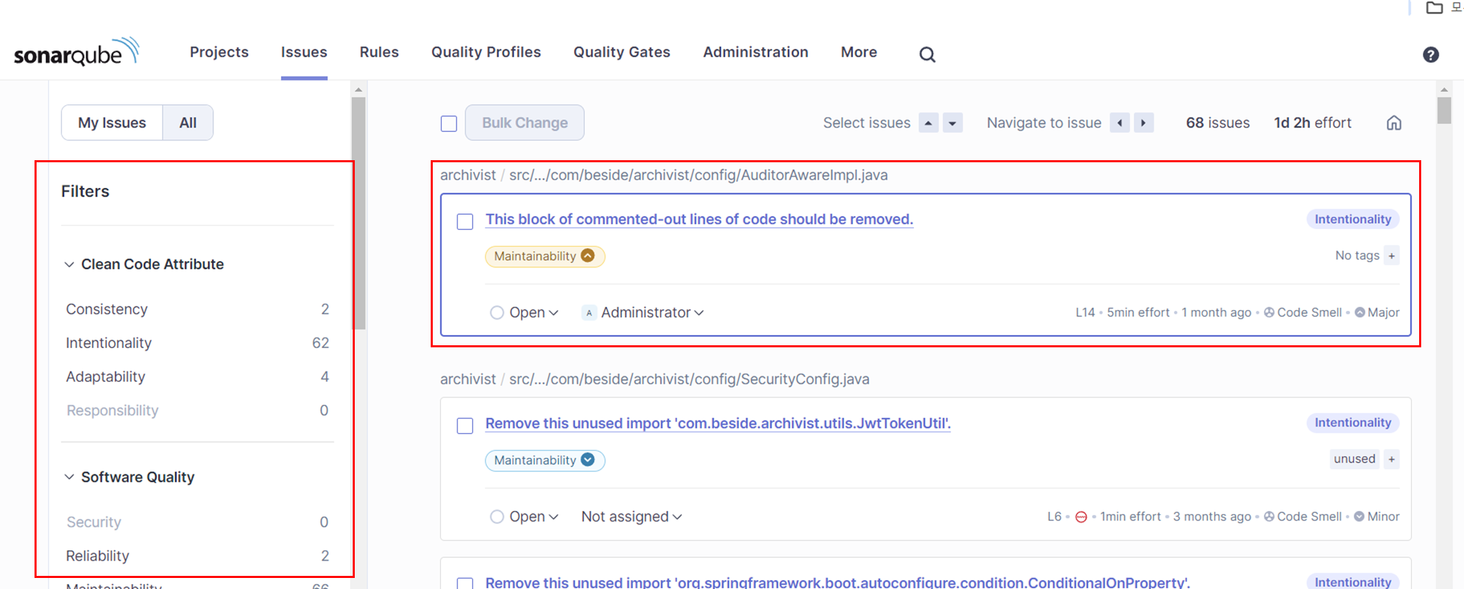 2. Issues Tab : 코드 분석을 통해 발견된 모든 문제 (버그, 취약점, 코드 스멜 등) 을 볼 수 있다. 심각도, 분류, 파일, 라인 넘버 등 다양한 방식으로 정렬할 수 있으며 Issue 를 할당하는 등 어떻게 처리할 지 결정할 수 있다.