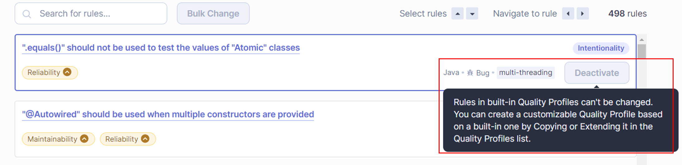그러나 내장된 품질 프로파일(Built-in Quality Profiles) 은 기본적으로 제공되는 설정을 가진 Profiles 이기 때문에 규칙을 변경할 수 없다. 수정된 규칙을 적용하고 싶은 경우에는 사용자 정의 Profile 을 만들어야 한다.