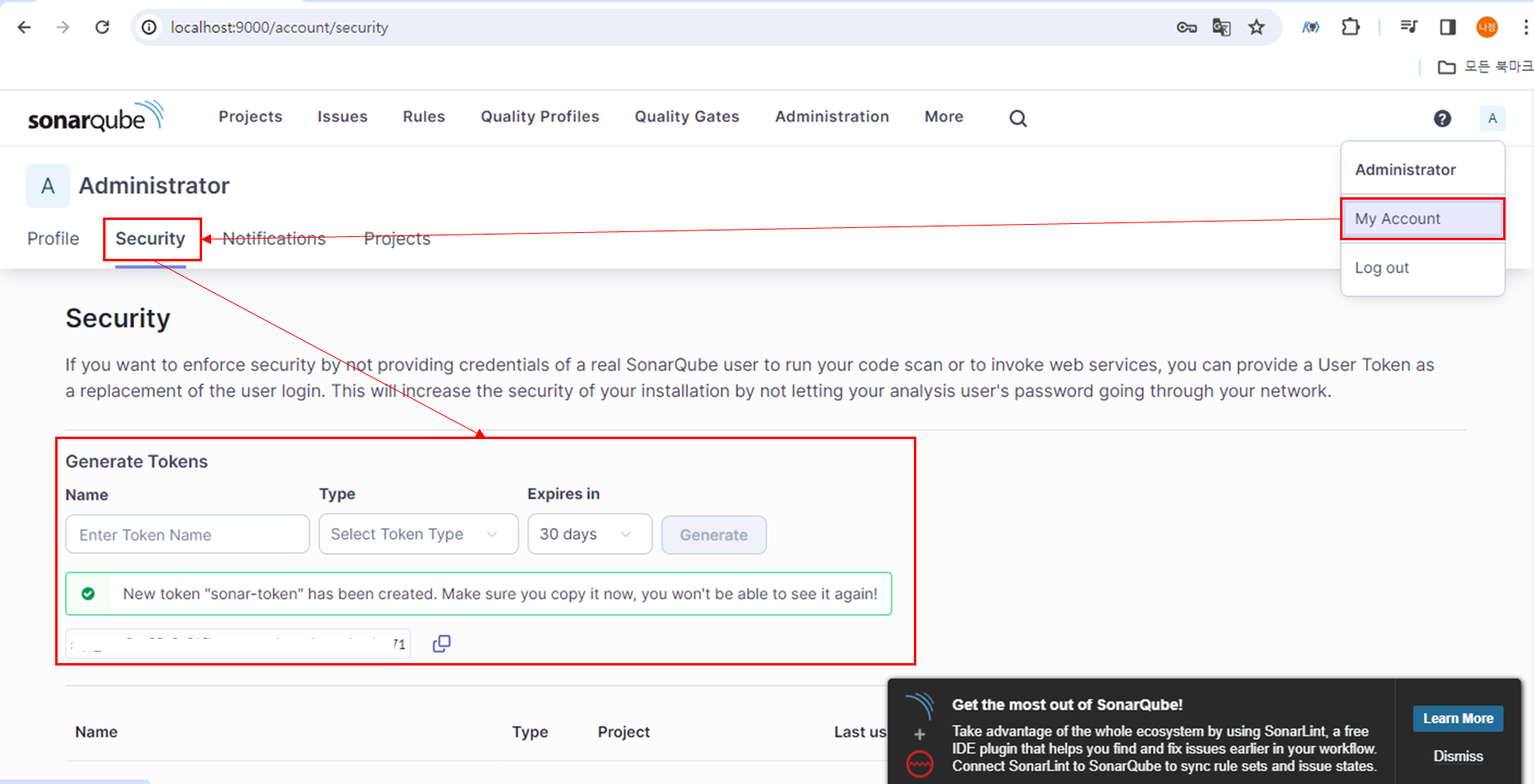 6. Administration Tab : 사용자 계정, 보안, 플러그인, 시스템 설정 등 SonarQube 인스턴스 설정을 관리할 수 있다.