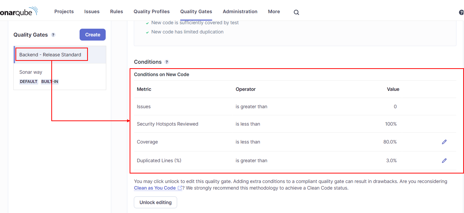 5. Quality Gates Tab : 프로젝트가 출시 전에 만족해야하는 품질 기준을 설정할 수 있다. ( ex> 버그 x개 이하, 코드 커버리지 x% 이상 등 )