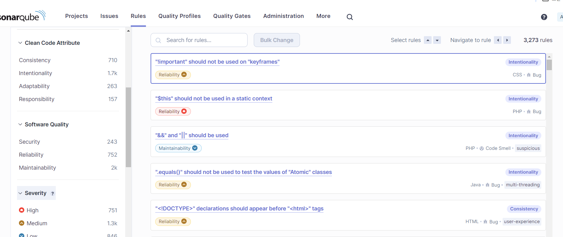3. Rules Tab : SonarQube 가 코드 분석에 사용하는 규칙들을 볼 수 있으며, 사용자는 이 규칙들을 기반으로 새로운 품질 프로필을 생성하거나 기존 프로필을 수정할 수 있다.