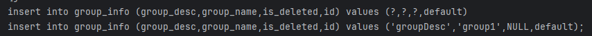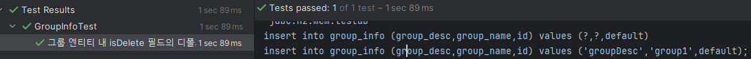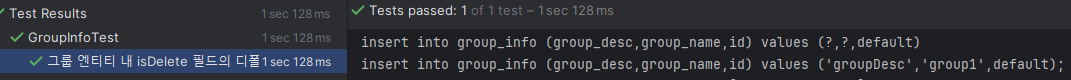 로그를 확인해보면 group_info 의 is_deleted 필드에 default 'N' 설정이 잘 들어가있기 때문에 혼란스러울 수 있지만 INSERT DATA 를 보면 isDeleted 필드가 null 값임을 확인할 수 있다.