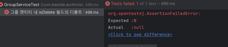 @DisplayName("그룹 엔티티 내 isDelete 필드의 디폴트 값은 'N' 이다.")