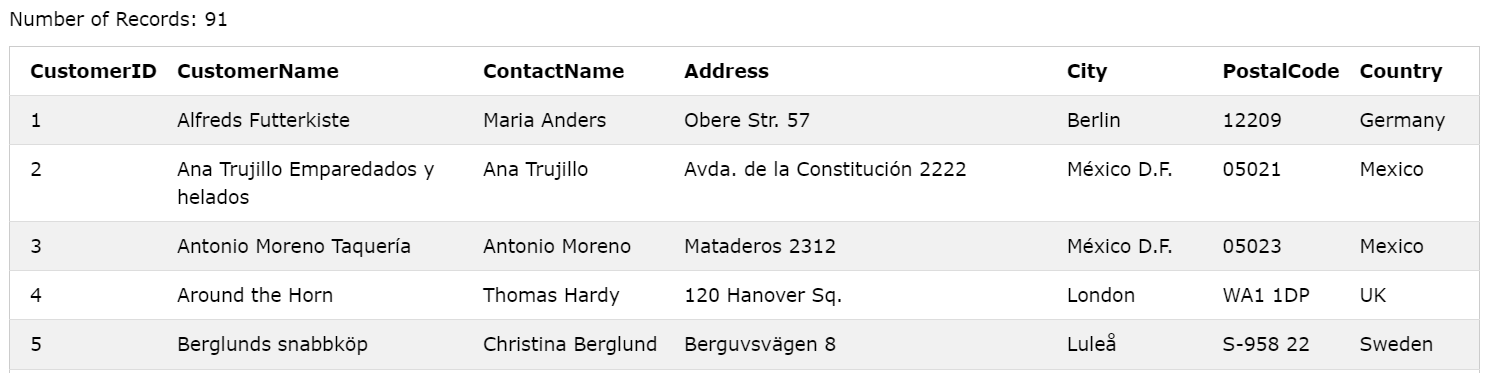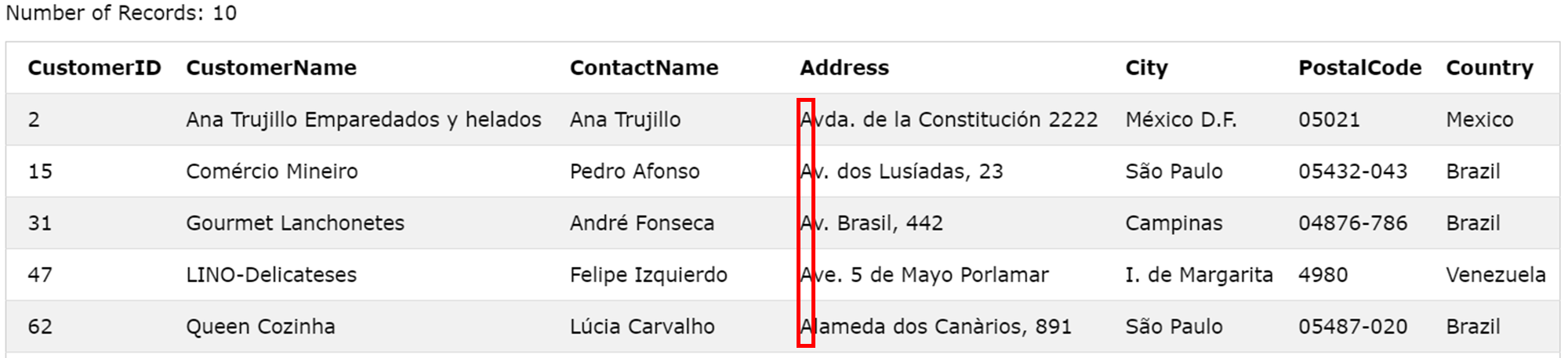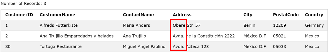 REGEXP 앞에 명시한 Address 컬럼에서 'Obere' 혹은 'Avda' 문자열을 포함한 데이터들이 출력된 것을 확인할 수 있다.