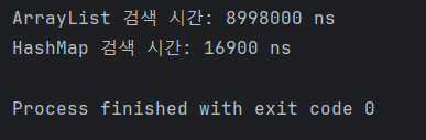 ArrayList 검색 시간은 8998 ms, HashMap 검색 시간은 16.9 ms 로 순차적으로 탐색하는 ArrayList 검색 시간의 속도가 많이 느려졌음을 확인할 수 있다.